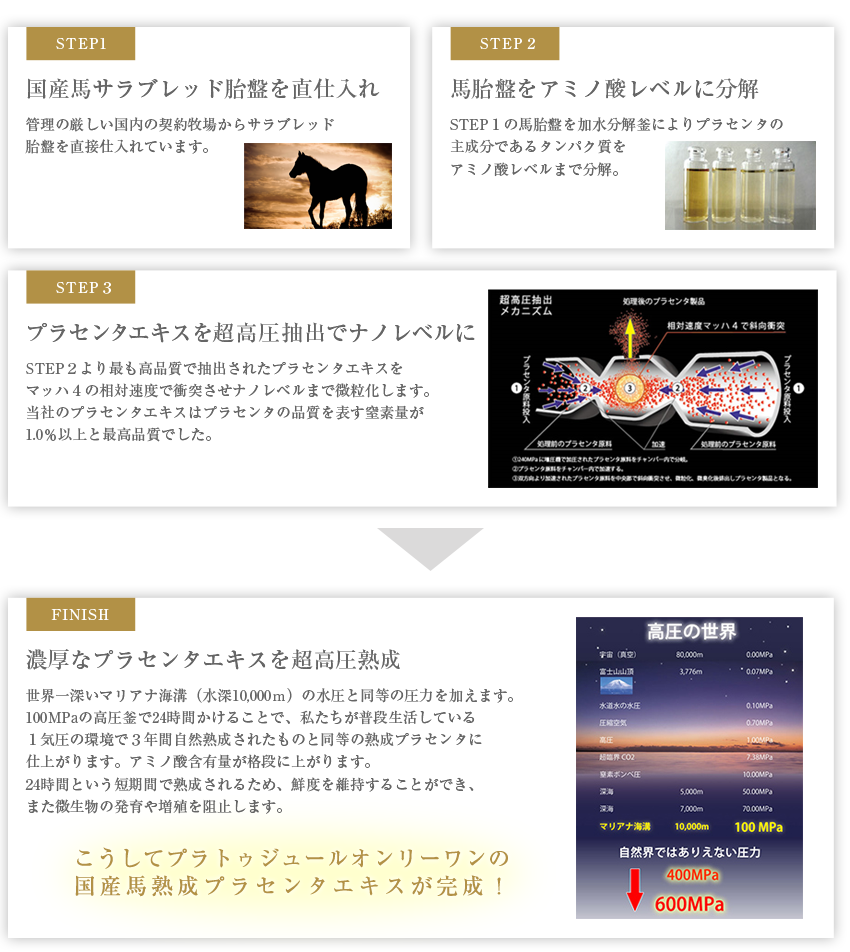 プラセンタの中でも特に馬プラセンタは特有の臭いがあります。高圧熟成の行程によりプラトゥジュールの馬プラセンタは濃度が高いにも関わらずにおいが気にならない高品質な製品をつくることができます。