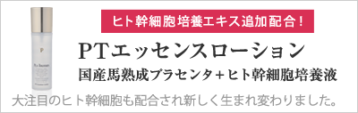 PTエッセンスローションは濃度100%の熟成馬プラセンタエキスを高濃度に配合した美容液化粧水です。誘導浸透・イオン化浸透・ナノ化浸透のトリプル浸透で肌深部までプラセンタエキスとその他の美容成分を届けます。