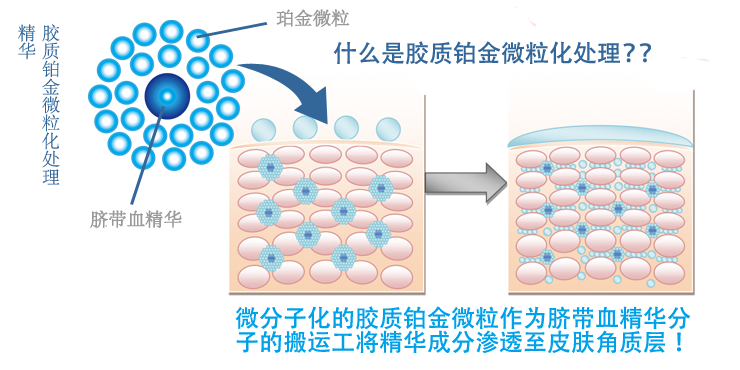 - 将粘性高的马脐带血进行胶质铂金微粒化处理实现向肌肤深层导入美容成分